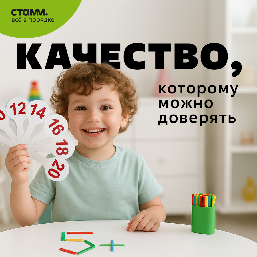 Составляющие касс цифр и счётных материалов «Учусь считать» от «СТАММ» выделяются за счёт толщины предметов в наборе – 1, 8 мм. Это обеспечивает комфорт и удобство во время занятий, ведь их легче удерживать и приятнее брать в руки.